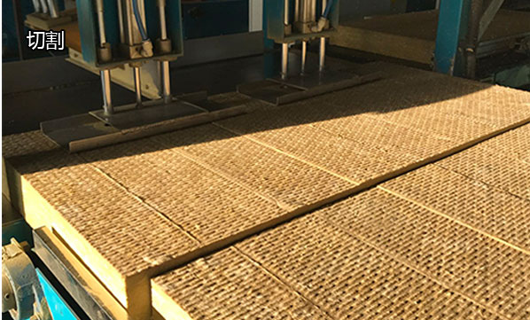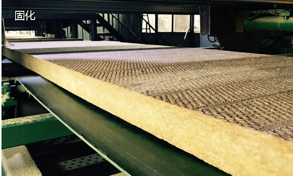 由履帶將布好的巖棉傳送至壓力設(shè)備中,使其形成一定密度的巖棉板,經(jīng)高溫烘干爐,使噴吹到巖棉里的高效粘合劑將巖棉粘合為一個(gè)整體,巖棉板經(jīng)高溫烘干后,送至冷卻出風(fēng)口使其冷卻固化后再經(jīng)履帶傳送至切割設(shè)備中,根據(jù)要求切割成規(guī)格產(chǎn)品。