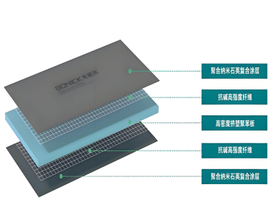 戈尼克聚合石英板是由高抗壓防水的XPS板為芯材,兩面采用抗堿高強度纖維加固,涂