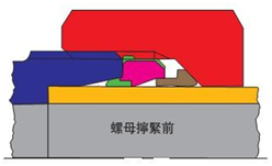 與傳統(tǒng)的金屬漸進式卡套不同,KDL 卡套在結(jié)構(gòu)上提供了一個耐油橡膠密封圈,如圖所示。硫化在金屬定位環(huán)位于接頭體 24°內(nèi)錐和鋼管的外壁之間,密封住了接頭唯一的泄漏通道, 不僅可封閉管內(nèi)的壓力流體,同時可以防止在管內(nèi)失壓的情況下空氣進入管路系統(tǒng)。這樣的密封接頭,密封效果與流體壓力值成正比,因此即使在高壓工況下也能同樣能具有極為理想的密封效果(額定工作壓力下,壓力與大,密封越好)。同時由于橡膠橡膠圈工作處于靜壓狀態(tài),使得其使用壽命也特別長。