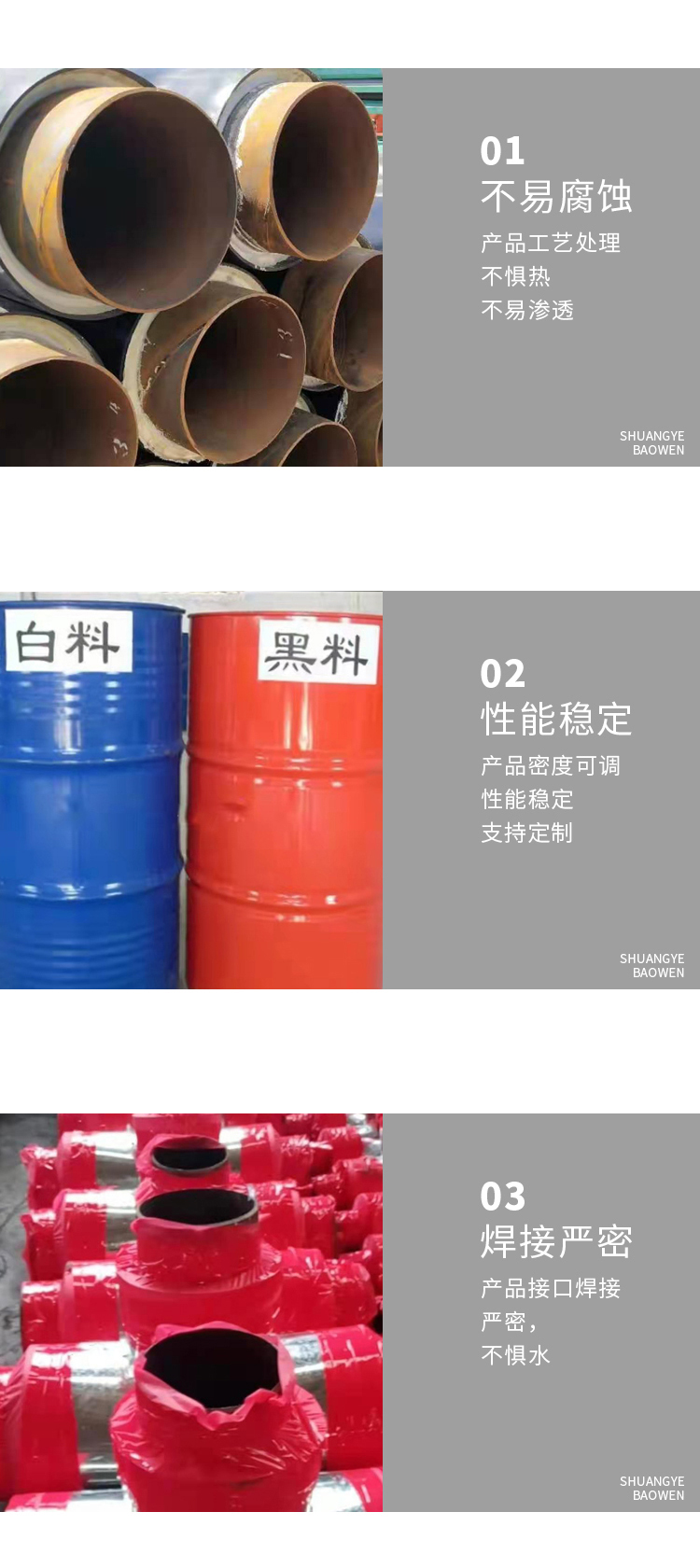 管道保溫層材料采用絕熱保溫性能優(yōu)良且導(dǎo)熱系數(shù)低的硬質(zhì)聚氨酯泡沫作為隔熱材料,不僅導(dǎo)熱系數(shù)低、機(jī)械性能好、長期耐熱高, 具有優(yōu)異的隔熱保溫性能,正常運(yùn)行后130℃的高溫水輸送到40公里以外時(shí),降溫僅為1℃左右。聚氨酯泡沫塑料在所有保溫材料中的導(dǎo)熱系數(shù)是小的,因此能使物料的熱損失降到限度,隔熱保溫性能優(yōu)良,廣泛應(yīng)用于各類熱水預(yù)制直埋管道的保溫層。